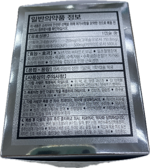 하루 2캡슐 복용 시 하루 마그네슘 301.6mg, 비타민E 1,000IU를 섭취하게 됩니다.